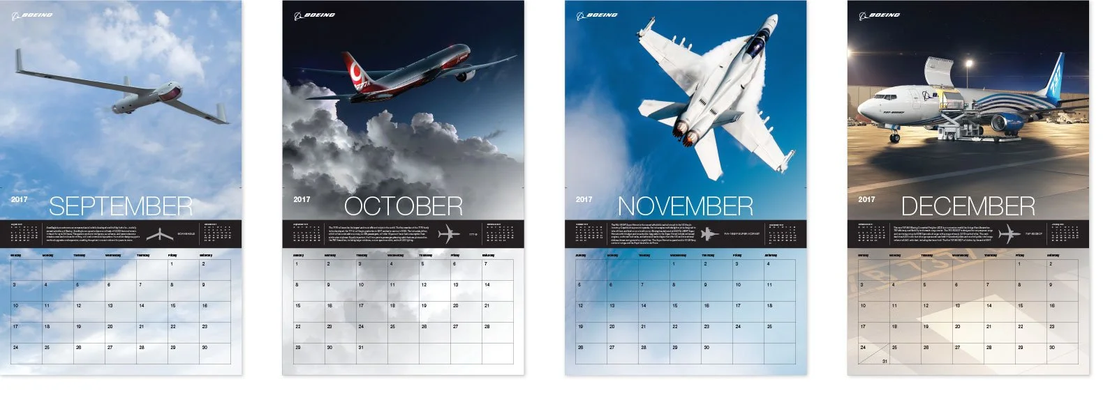 Every year, the Boeing Store produces an exclusive, high-quality calendar that highlights and showcases the innovative and awe-inspiring products that Boeing produces.