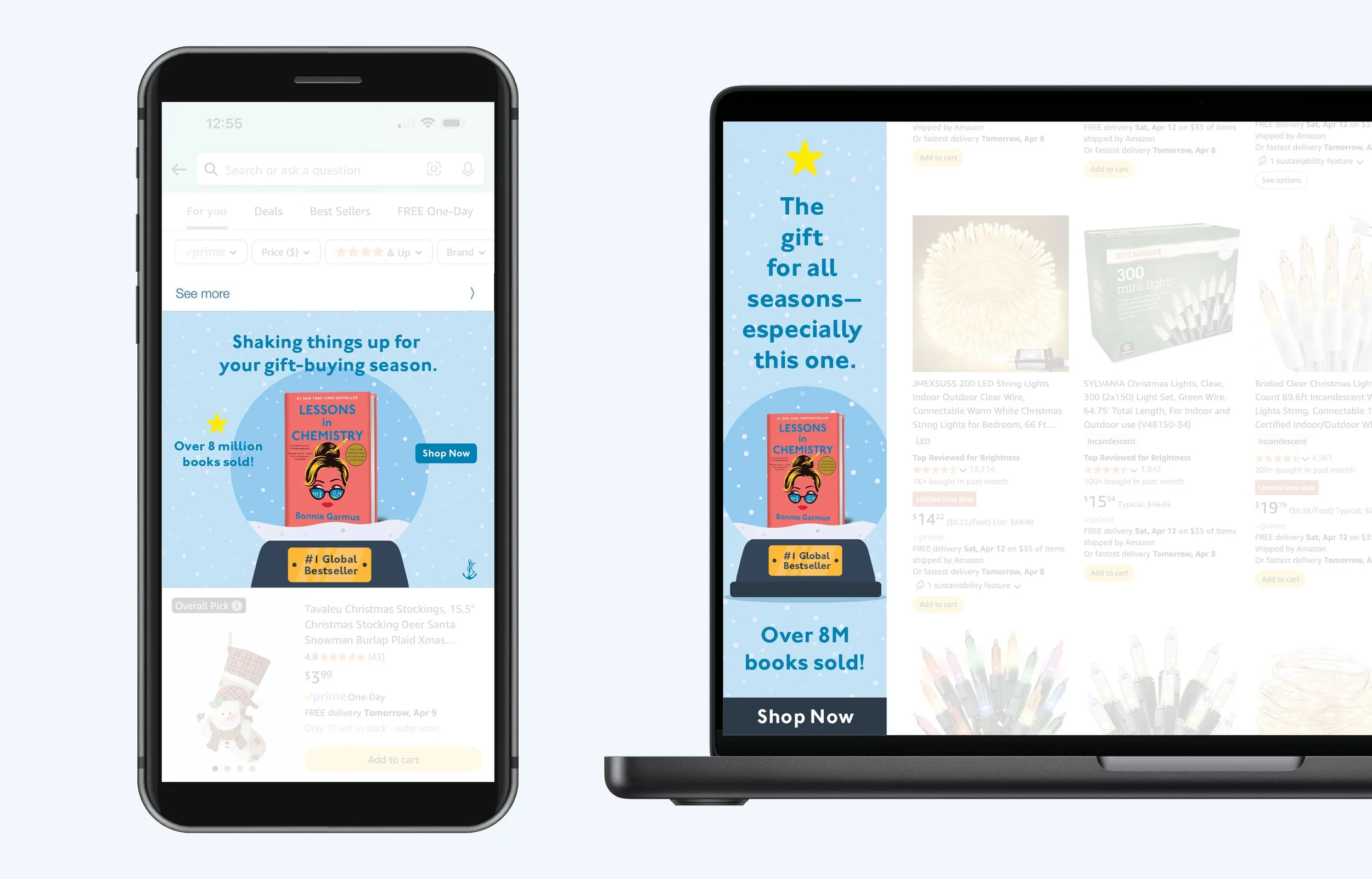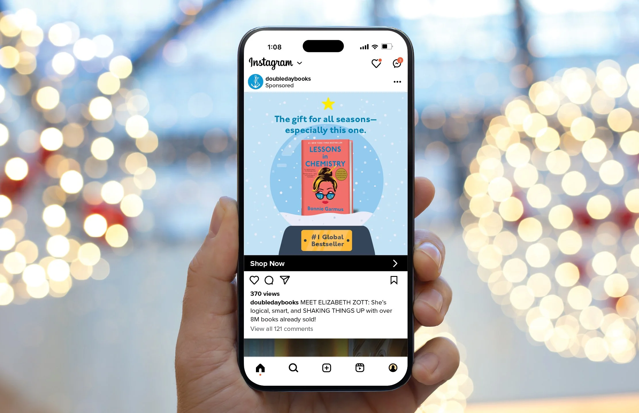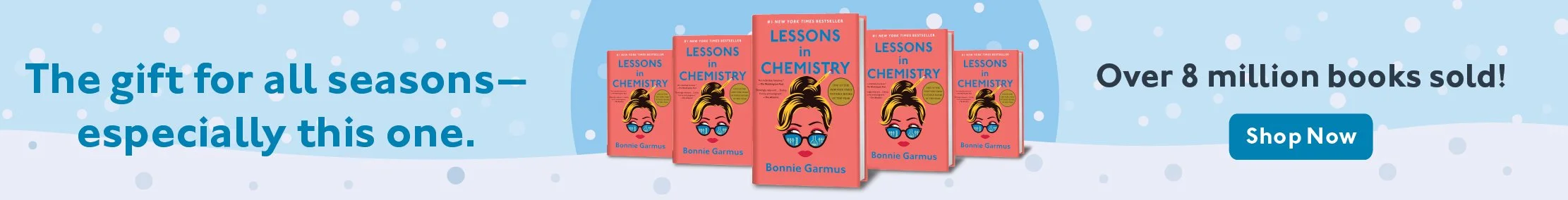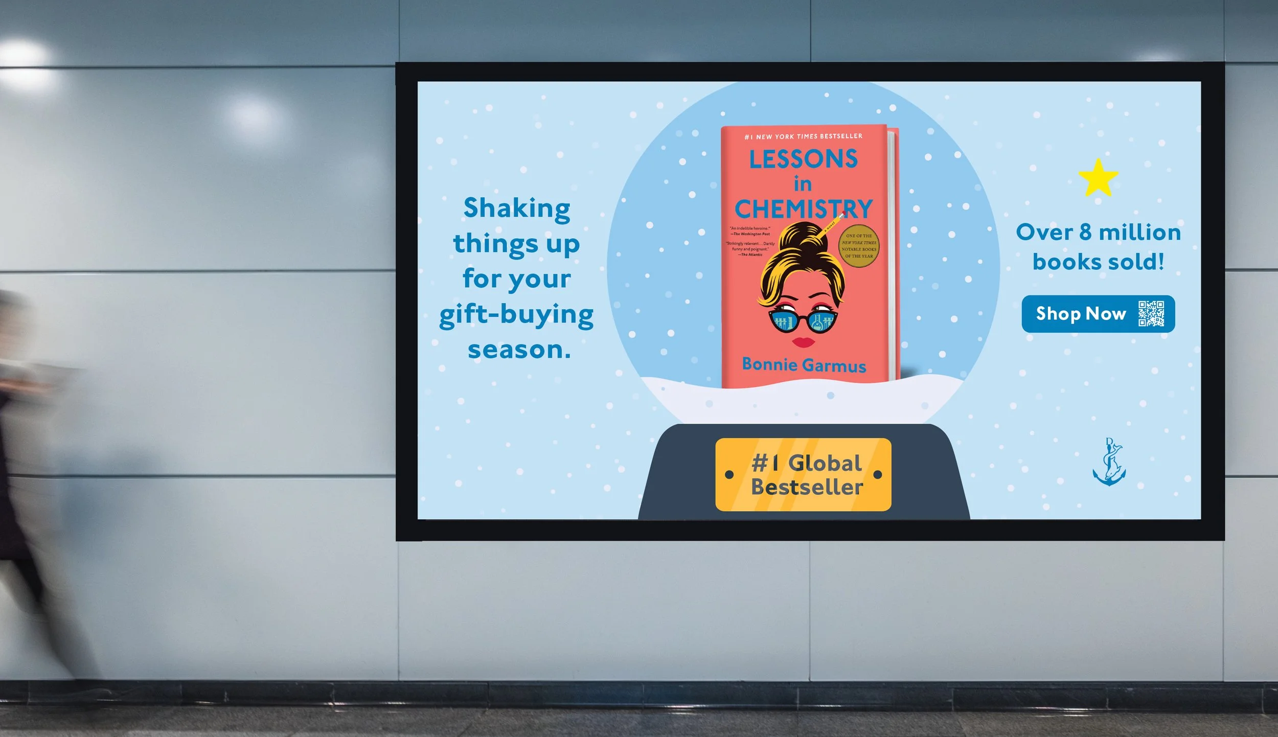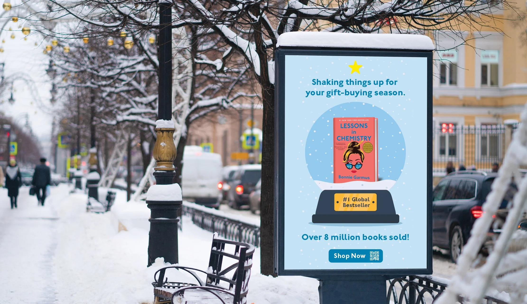Shake Things Up, an advertising campaign NakagawaCo developed for Knopf Doubleday to promote The New York Times best-seller, Lessons in Chemistry. Set against the backdrop of the holiday season, the campaign showcased the cover in a festive, clever way, with messaging that reflected the spirit of Elizabeth Zott—the main character, a chemist and unapologetic STEMinist shaking up the status quo.