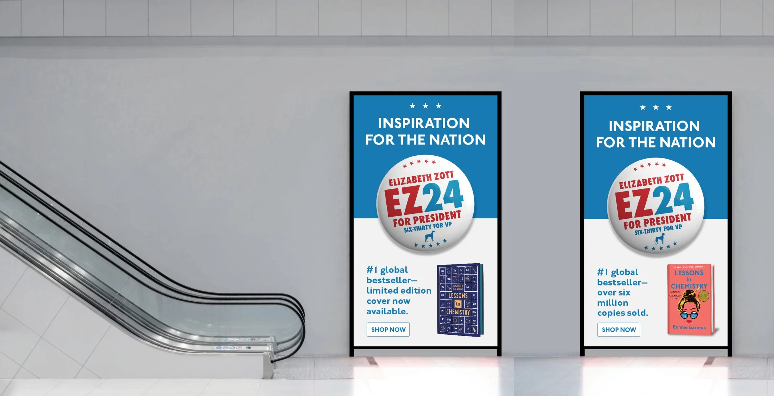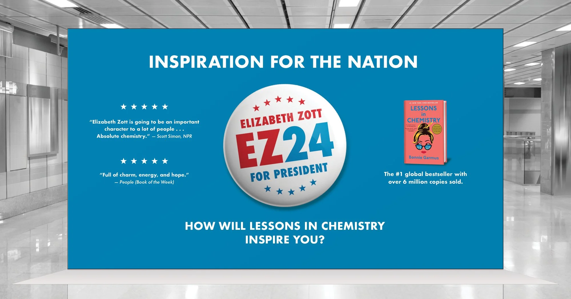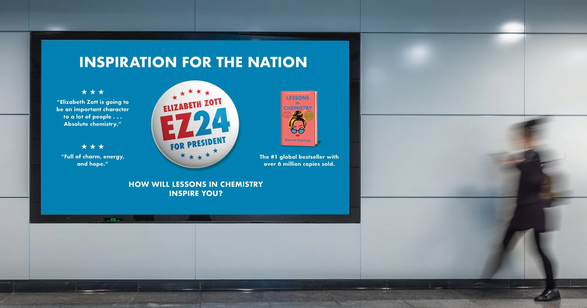 Building on a tradition of compelling narratives, NakagawaCo delivered an advertising campaign for The New York Times best-selling novel, Lessons in Chemistry, designed to be both timely and reflective of the energy surrounding the election season. Working with the author, NakagawaCo transformed the main character from a fictional icon into a satirical presidential candidate, using familiar campaign elements to blur the lines between life and art.